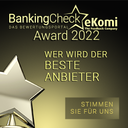 Auch in diesem Jahr hoffen wir auf Ihre Unterstützung. Ihre Stimme entscheidet beim BankingCheck und eKomi Award 2022. Bewerten Sie uns und teilen Sie Ihre Erfahrungen mit unseren Services und Produkten.